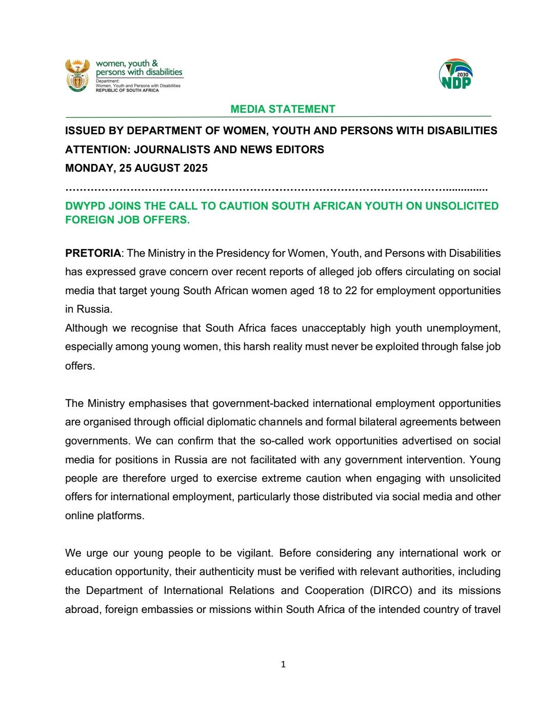 A notable event occurred on August 25, 2025, when the South African Department of Women, Youth and Persons with Disabilities issued a warning about suspicious job offers in Russia that have recently been widely advertised on social networks. Authorities acknowledge they cannot cope with youth unemployment but urge people not to risk their safety out of desperation.