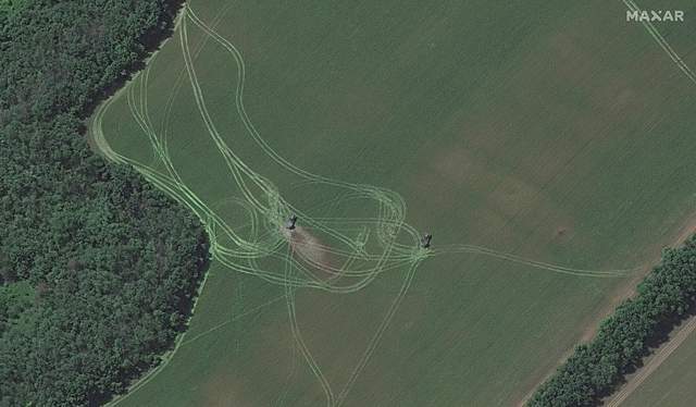 Just outside of the city, satellite images show a Russian multiple rocket launch systems pointed toward the city. Scorch marks around one of the systems is a telltale sign that its rockets have targeted Severodonetsk. Towed artillery nearby are also pointed toward the city.