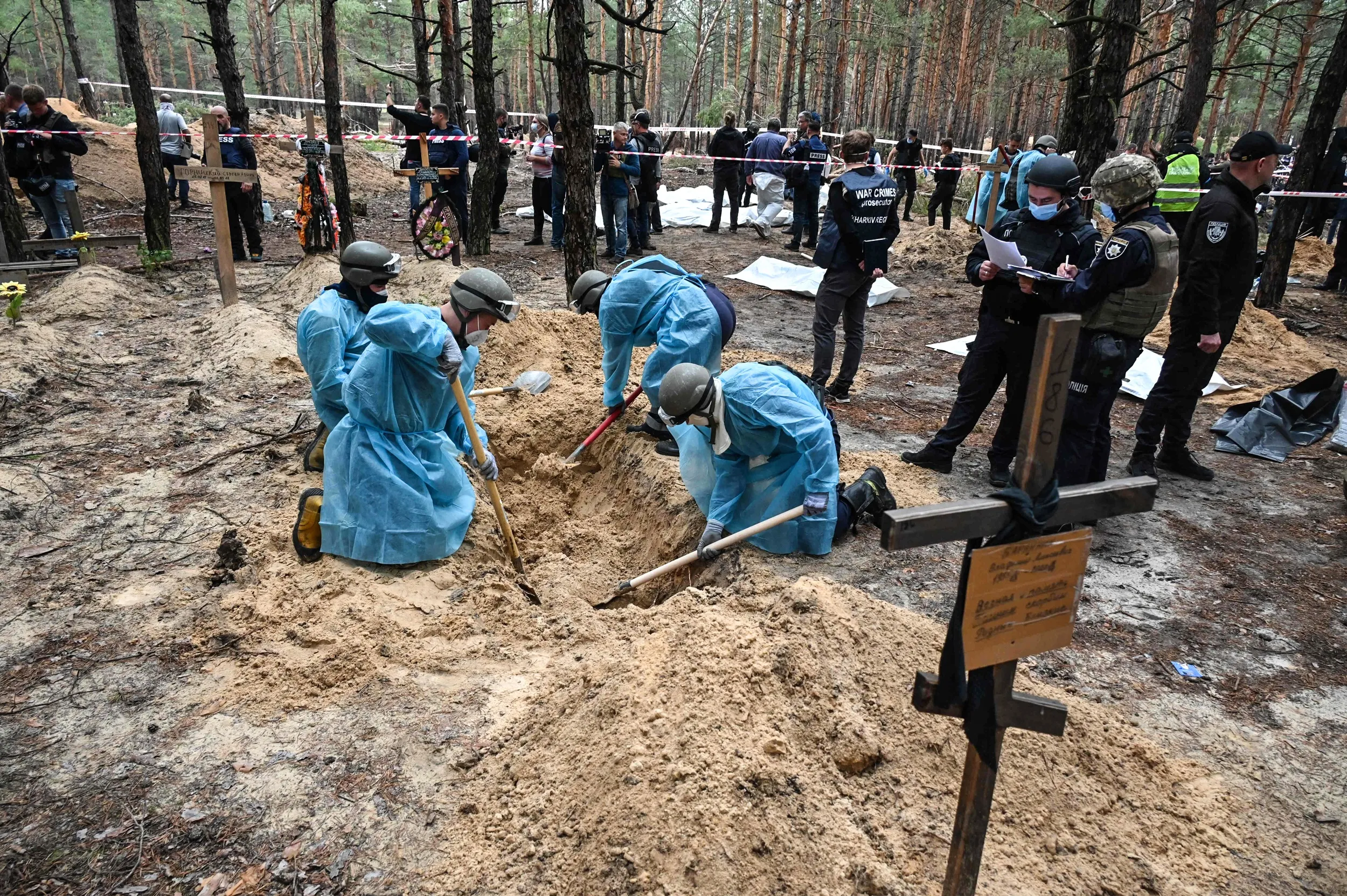 Bodies are exhumed in retaken Izyum in northeastern Ukraine / AFP