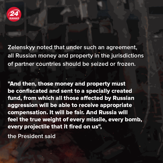 "And then, those money and property must be confiscated and sent to a specially created fund, from which all those affected by Russian aggression will be able to receive appropriate compensation. It will be fair. And Russia will feel the true weight of every missile, every bomb, every projectile that it fired on us", the President said.